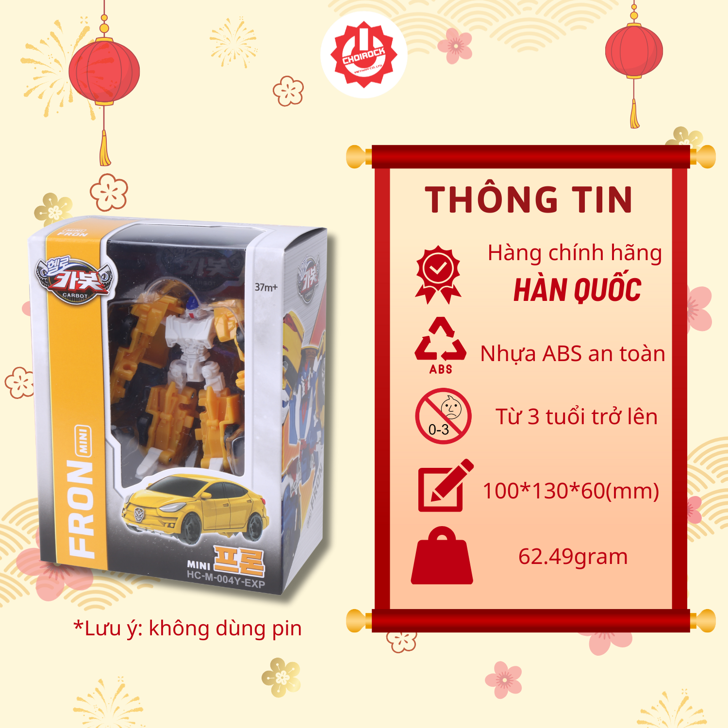 - HELLO CARBOT Mini Fron là một nhân vật tuyệt vời được mô phỏng theo một nhân vật trong bộ phim cùng tên Xin Chào Carbot. Đồ chơi Mini Fron mang đến cho các bé trải nghiệm lắp ráp và biến hình đầy thú vị. Với khả năng chuyển đổi giữa hai dạng xe hơi và robot chỉ trong vài bước đơn giản, sản phẩm này không chỉ giúp trẻ giải trí mà còn kích thích trí tưởng tượng và phát triển các kỹ năng tư duy quan trọng.