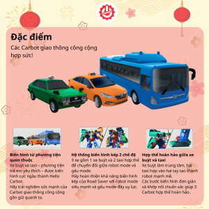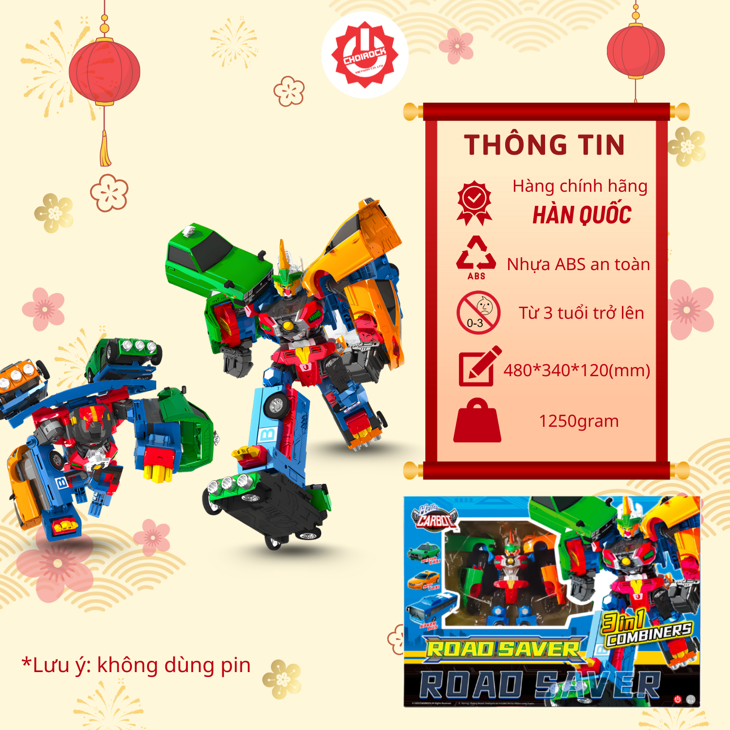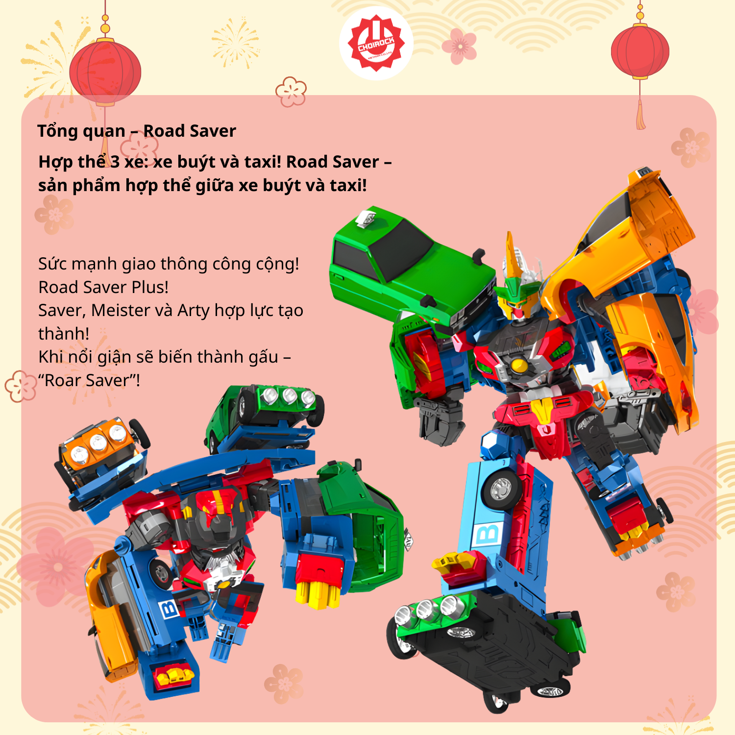 Road Saver là mô hình robot biến hình độc đáo, được tạo thành từ ba chiếc xe hơi riêng biệt. Sau khi lắp ráp, ba Carbot nhỏ gồm Arty Taxi, Saver và Meister Taxi sẽ kết hợp lại với nhau để tạo thành một robot chiến binh mạnh mẽ – Road Saver. Mỗi chiếc xe có thể chơi độc lập hoặc ghép lại thành một thể thống nhất, mang đến trải nghiệm chơi đa dạng và hấp dẫn hơn bao giờ hết.