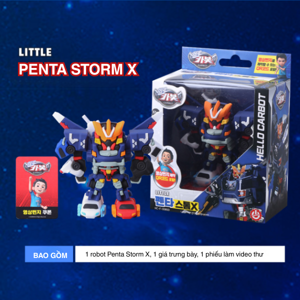Trong thế giới Hello Carbot, Penta Storm X luôn được biết đến như một chiến binh hợp thể tối thượng, sở hữu sức mạnh áp đảo và tinh thần quả cảm. Được tạo thành từ 5 phương tiện khác nhau, nhân vật này chính là biểu tượng của sự đoàn kết, trí tuệ và sức mạnh vượt trội. Trên màn ảnh, Penta Storm X đã không ít lần dẫn dắt các Carbot khác vượt qua kẻ thù, bảo vệ hòa bình cho nhân loại.