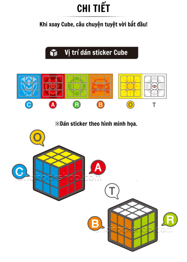 Hello Carbot Cube 3×3 là phiên bản rubik đặc biệt lấy cảm hứng từ thương hiệu hoạt hình Hello Carbot nổi tiếng. Trên mỗi mặt của khối rubik đều có thể dán bộ sticker độc quyền gồm 6 màu sắc sinh động, tương ứng với các chữ cái C – A – R – B – O – T, tạo nên dấu ấn riêng biệt cho dòng đồ chơi này.
