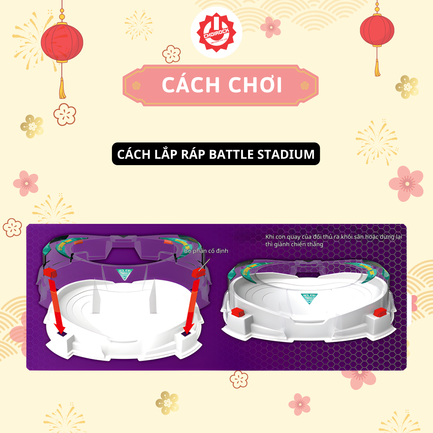 Sàn đấu Battle Stadium được thiết kế với kích thước rộng, giúp các con quay có không gian thoải mái để xoay và va chạm. Bề mặt sàn được thiết kế với các đường rãnh và gờ nhỏ, tạo ra những thử thách và tăng thêm tính cạnh tranh cho các trận đấu.