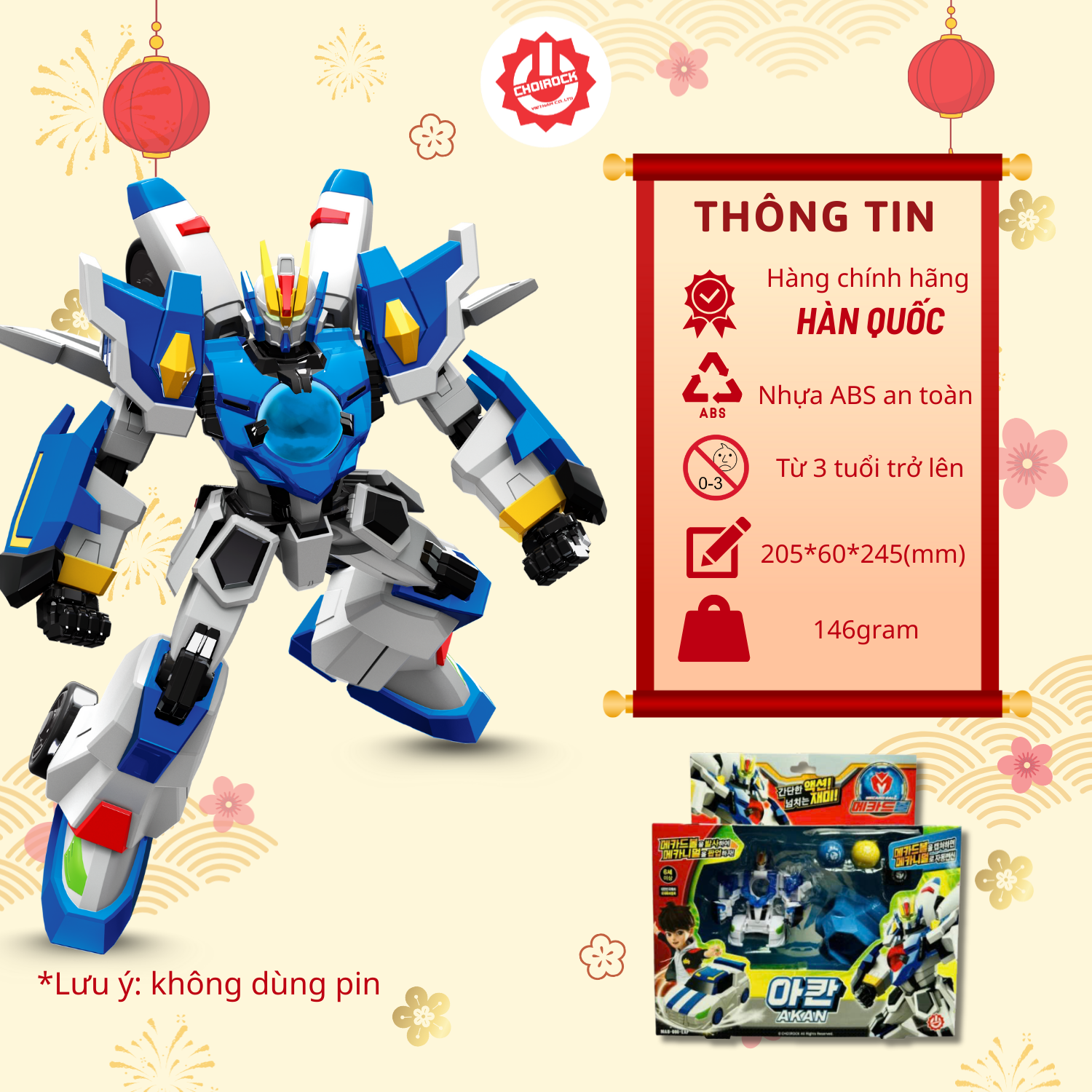 Akan là một trong những robot nổi bật trong loạt sản phẩm Mecardball – sở hữu thiết kế ấn tượng với màu xanh dương chủ đạo, dáng vẻ dũng mãnh và có thể biến hình linh hoạt thành một chiếc xe đua cực ngầu! Cùng nhân vật chính đồng hành trong hành trình thu thập Mecardball, AKAN sẽ giúp bé bước vào thế giới phiêu lưu đầy màu sắc và thử thách.